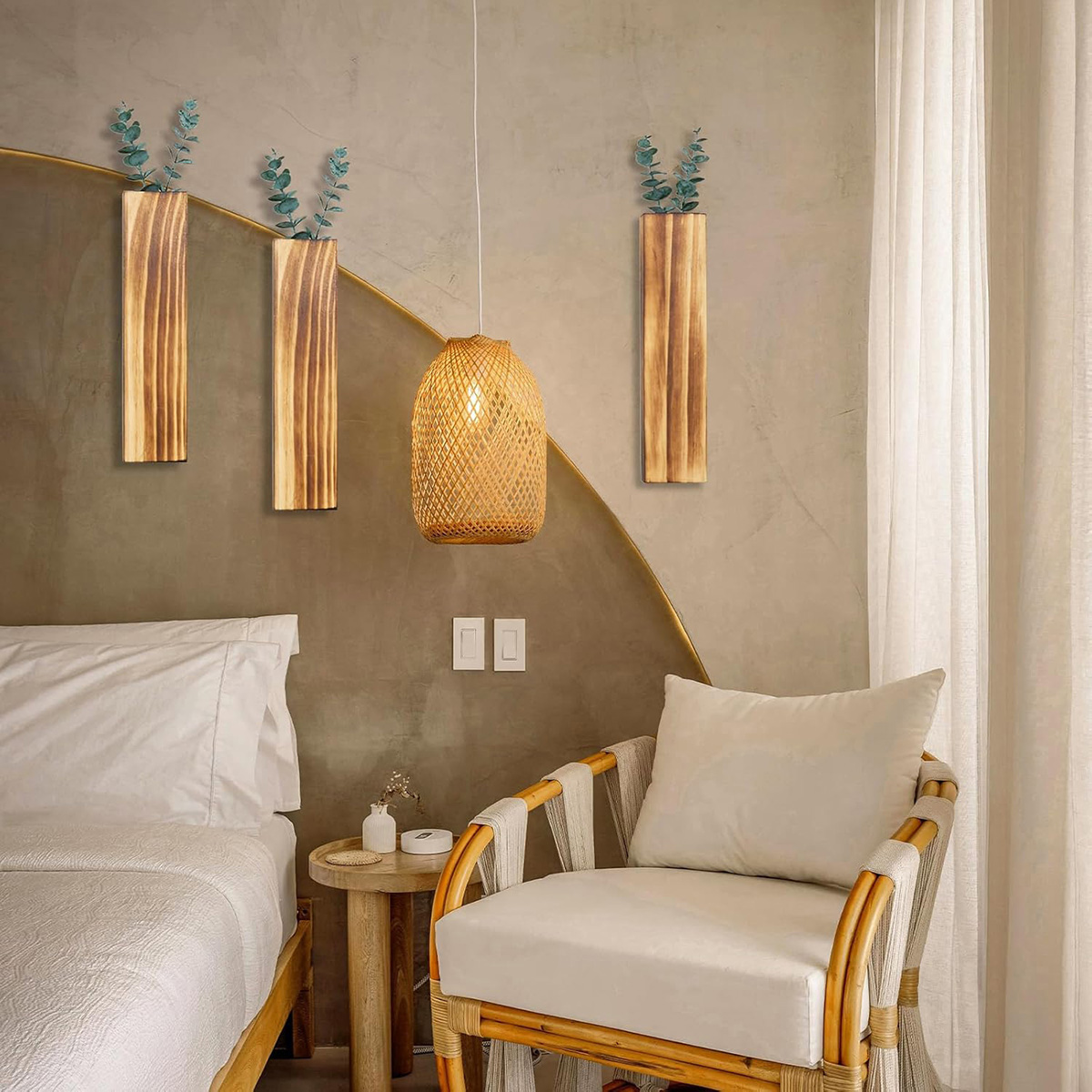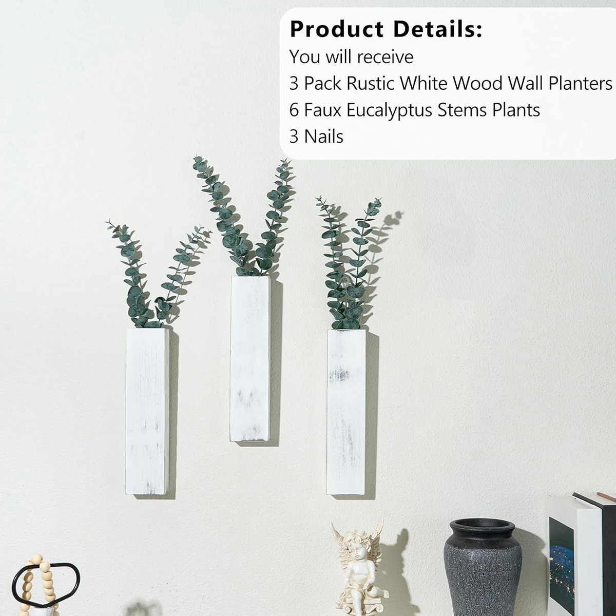 3 Pack Wood Wall Planters with 6 Pcs Artificial Eucalyptus, Plant Wall Decor, Rustic White