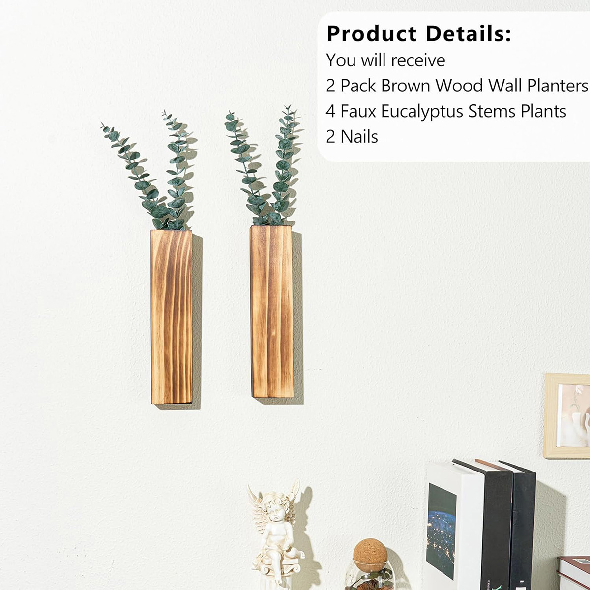 2 Pack Wood Wall Planters with 4 Pcs Artificial Eucalyptus, Plant Wall Decor, Brown