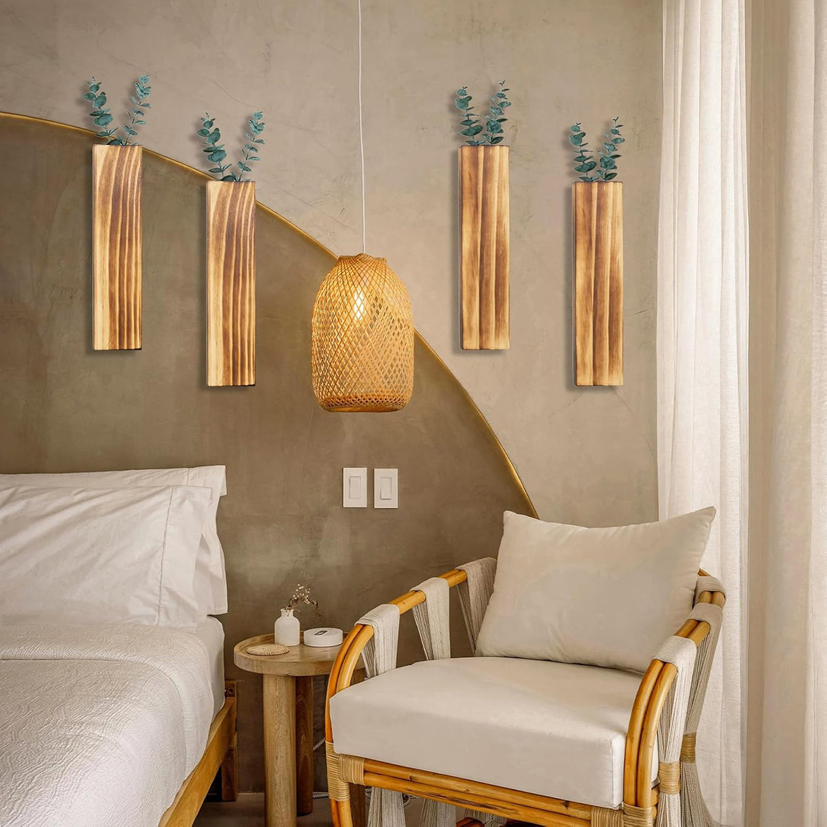 6 Pack Wood Wall Planters with 12 Pcs Artificial Eucalyptus, Plant Wall Decor, Brown
