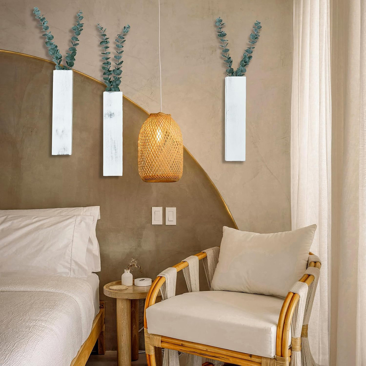 3 Pack Wood Wall Planters with 6 Pcs Artificial Eucalyptus, Plant Wall Decor, Rustic White
