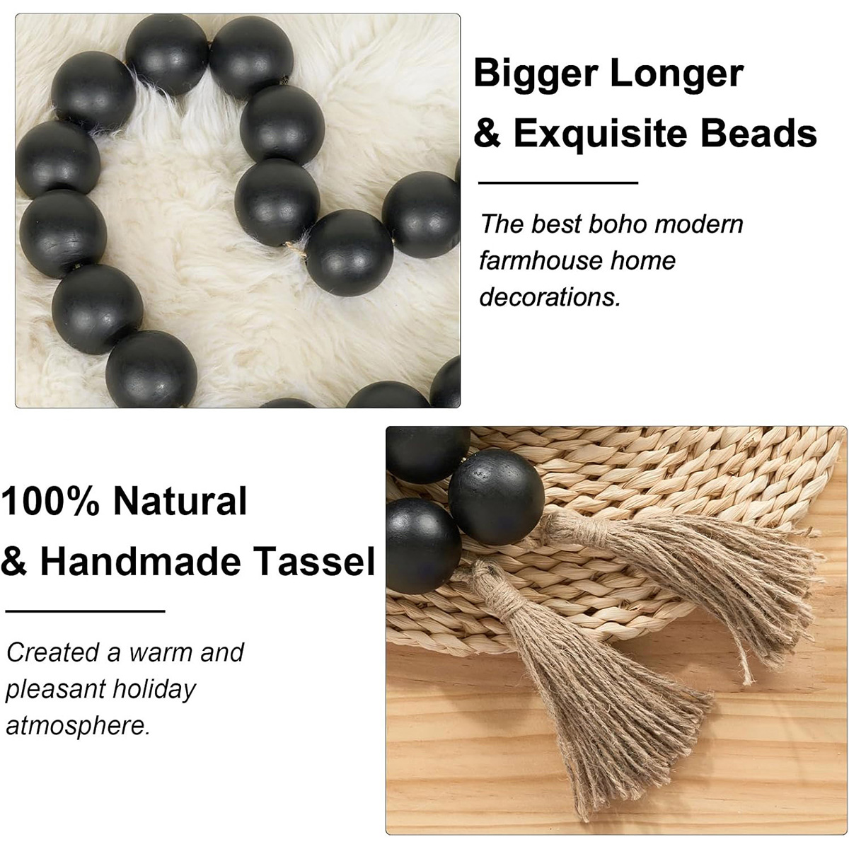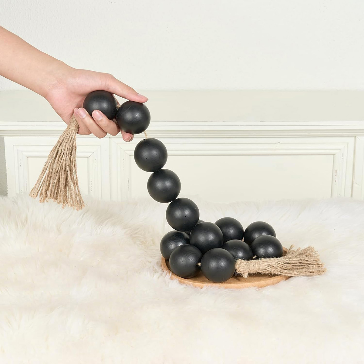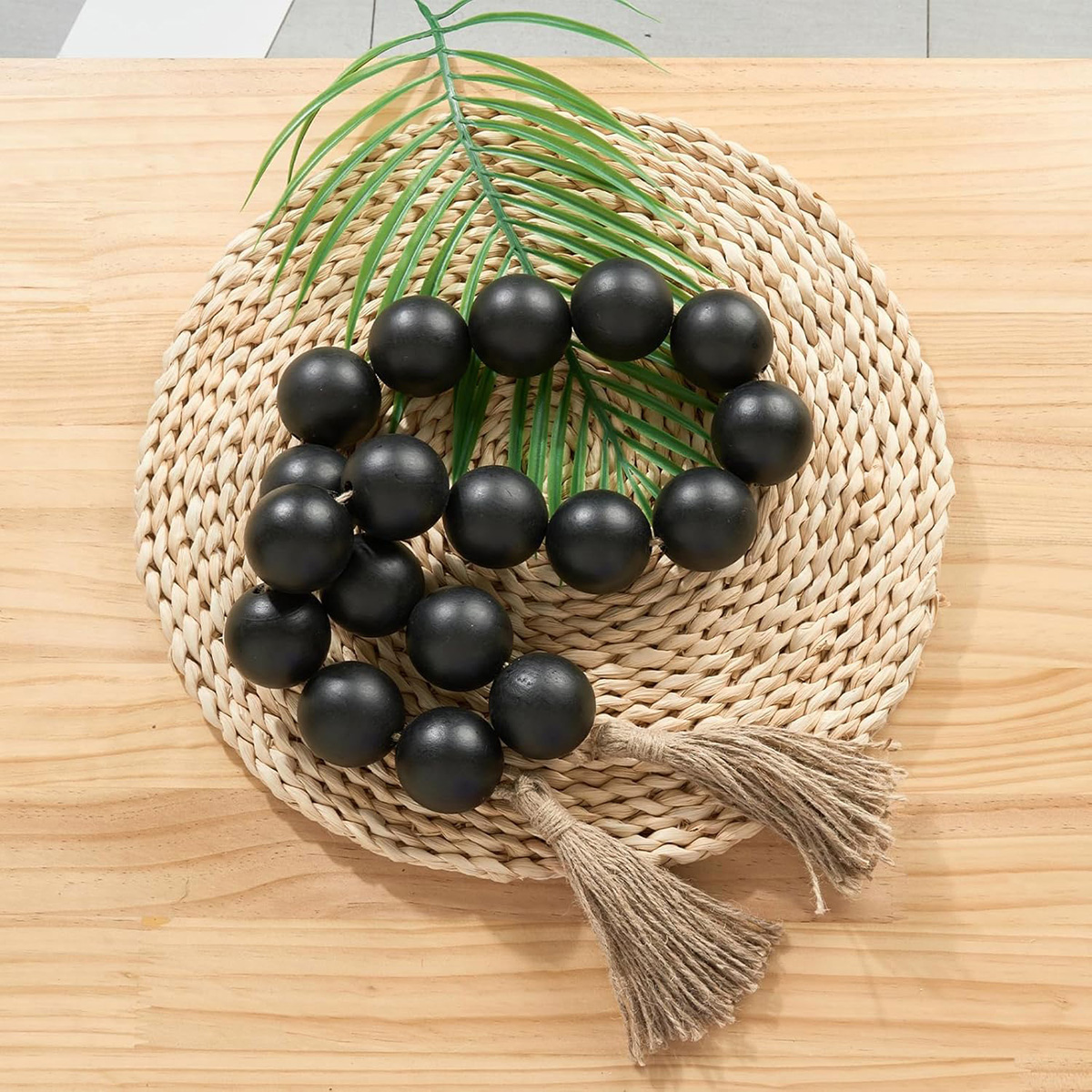 - PERFECT EXTRA LARGE DECORATIONS: Extra large 49 inches black long wooden garland decor, can be placed on any antique bowl, table, bookshelf, mantle, dining room table, farmhouse, perfect length for boho decor and minimalist modern decor. Each black large decorative beads is a natural wood bead with a unique look and pattern, with 2 large tassels handmade with natural jute rope, the tassels are 6.7 inches long to maximize the natural beauty.
