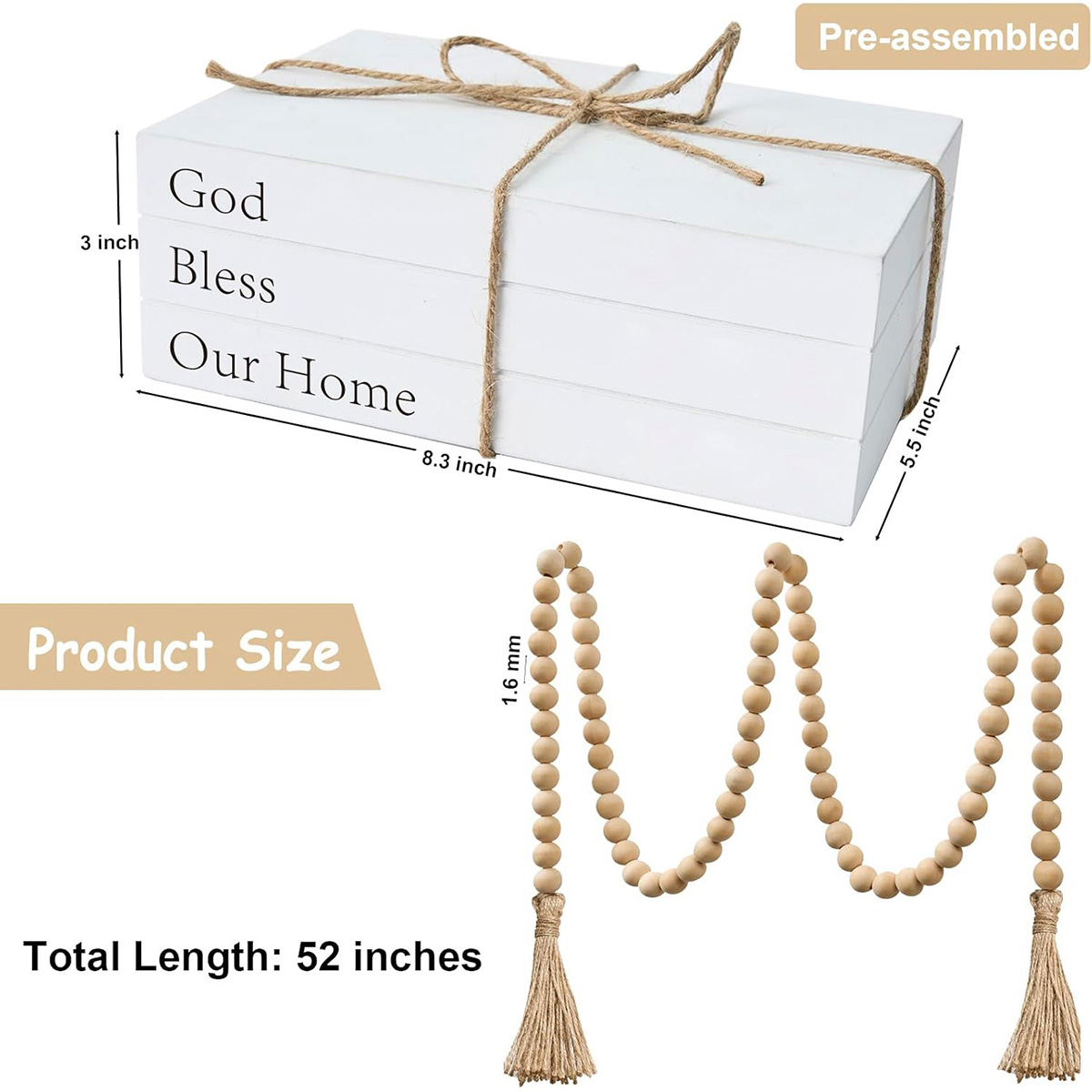 - What You’ll Receive: a set of decorative white books that say "God bless our home". The set also includes a farmhouse bead garland with tassels, creating a stylish look for your bookshelf, nightstand, coffee table and fireplace.