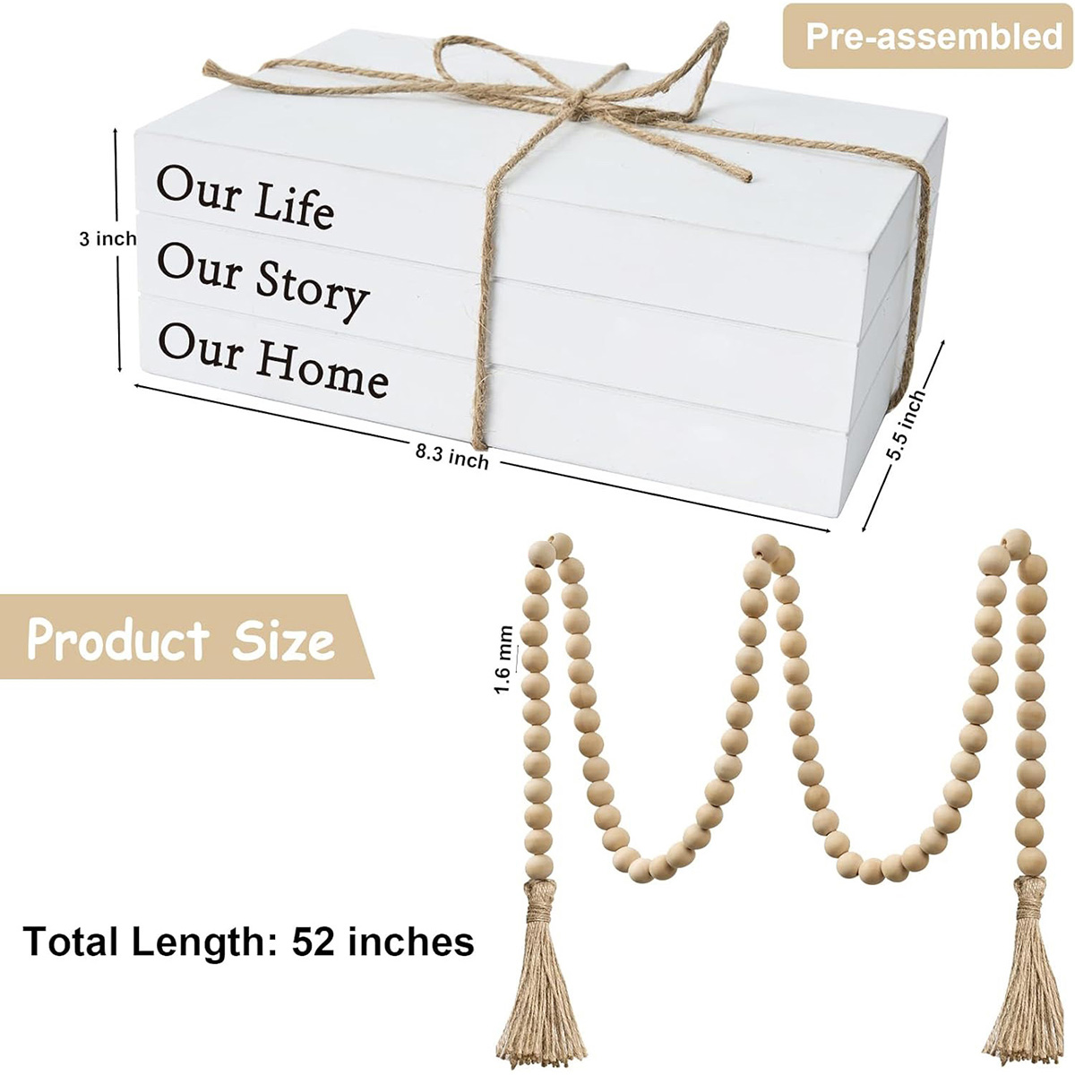 - What You’ll Receive: a set of decorative white books that say "Our Life Our Story Our Home". The set also includes a farmhouse bead garland with tassels, creating a stylish look for your bookshelf, nightstand, coffee table and fireplace.