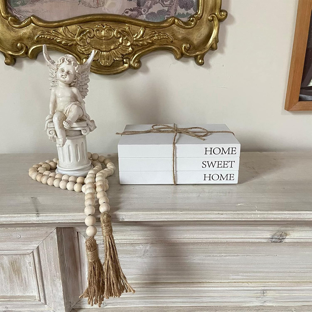 - What you’ll receive: a set of decorative white books that say "Home, Sweet, Home." The set also includes a farmhouse bead garland with tassels, creating a stylish look for your bookshelf, nightstand, coffee table and fireplace.