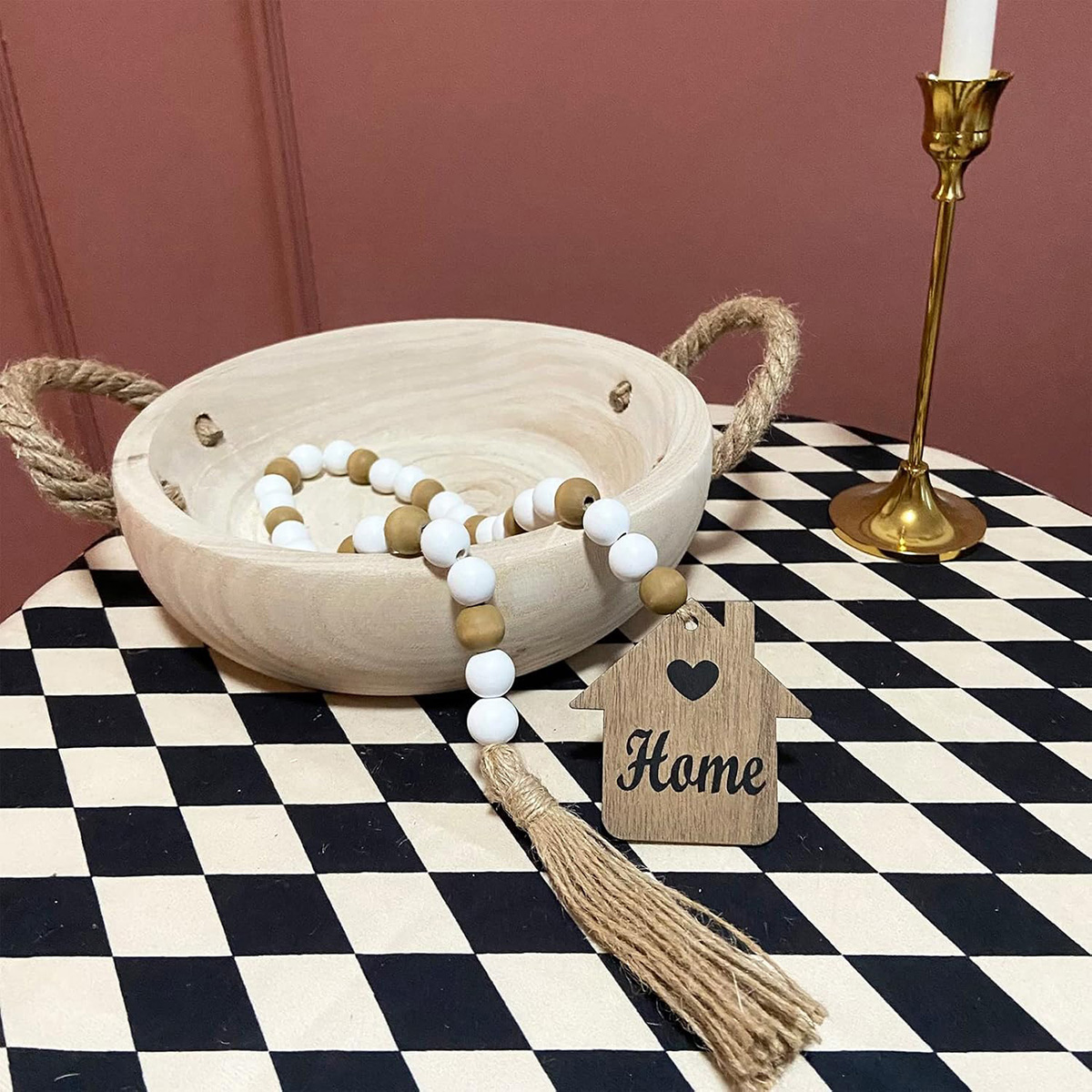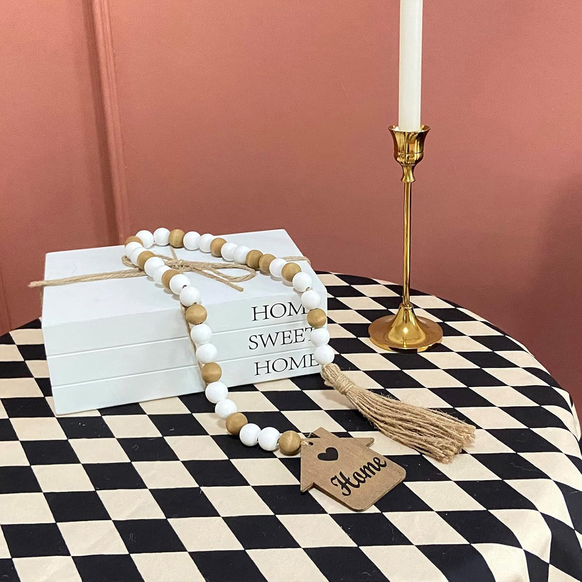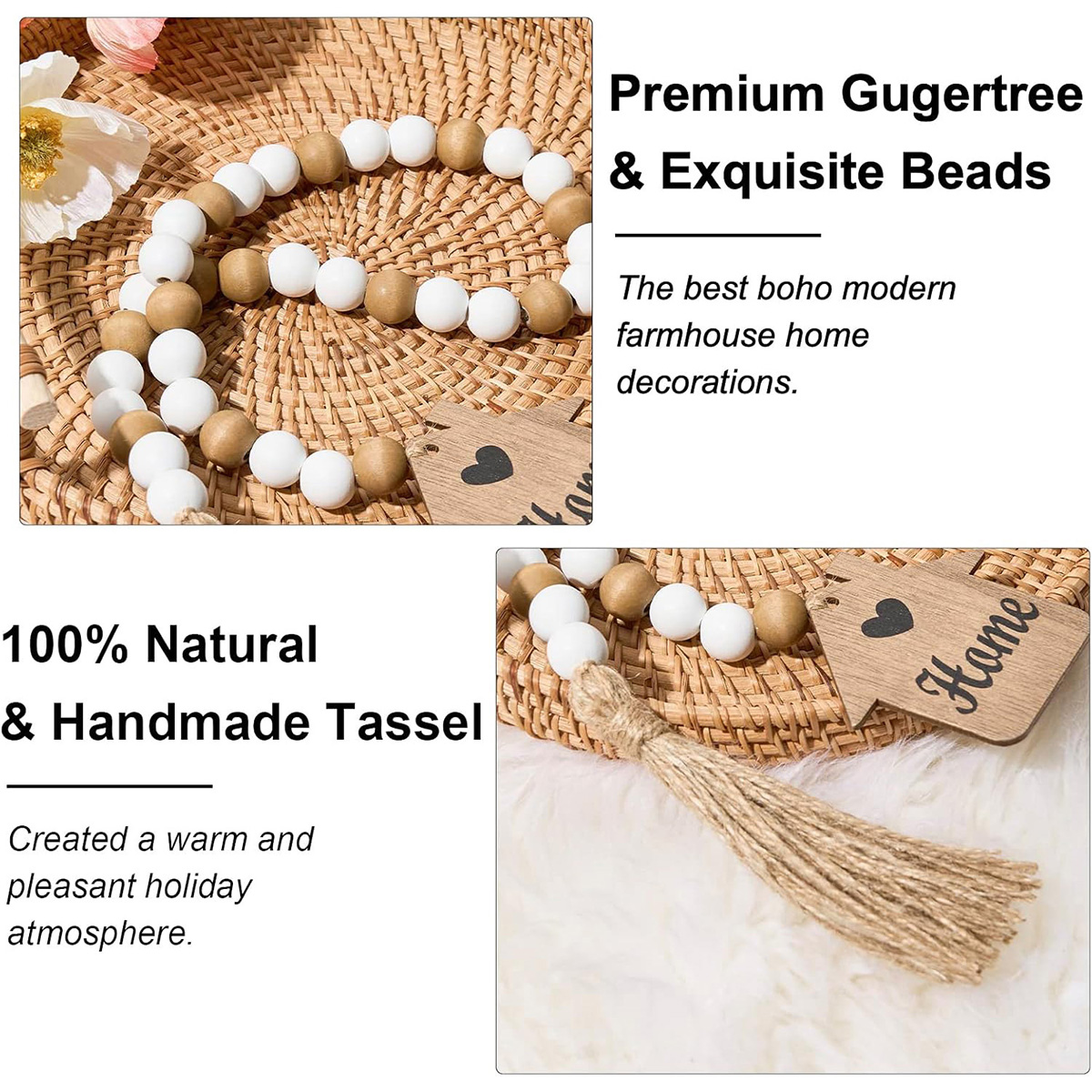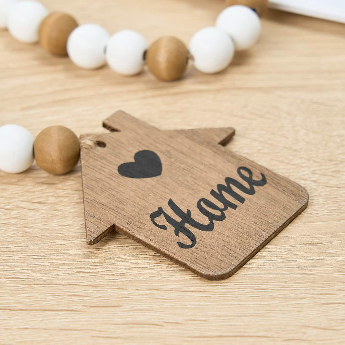 - HANDMADE WOODEN BEADS GARLANDS: Rustic bead garlands are handmade from natural wood beads, house plague and jute. Garland beads come in 2 styles: 16mm white wooden beads and brown decorative beads. The house-shaped wooden sign is specially textured with brown wood panels and printed with love and "HOME", full of warmth and happiness. It adds a warm, happy, and festive holiday atmosphere.
