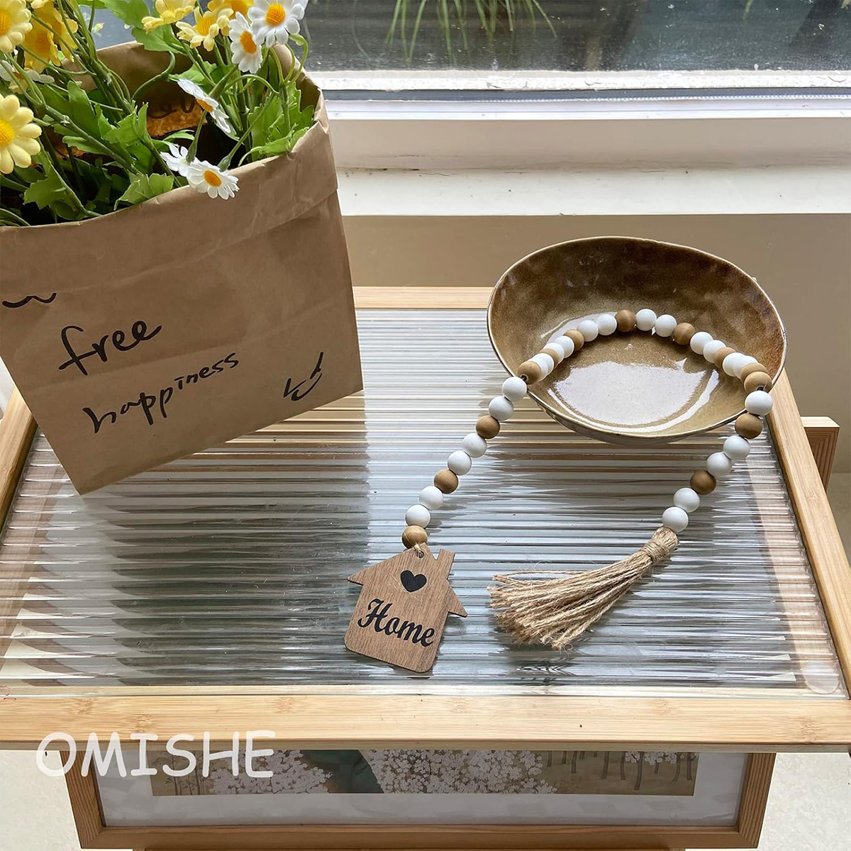 - GREAT HOME DECORATIONS: Beaded garland can decorate tiered tray, vase and dining table, can be hung on wall, shelf, mirror, bed post, bedside, window, fireplace. This wooden beads tassel garland hanger can be a great decoration for house, wall, tiered tray.