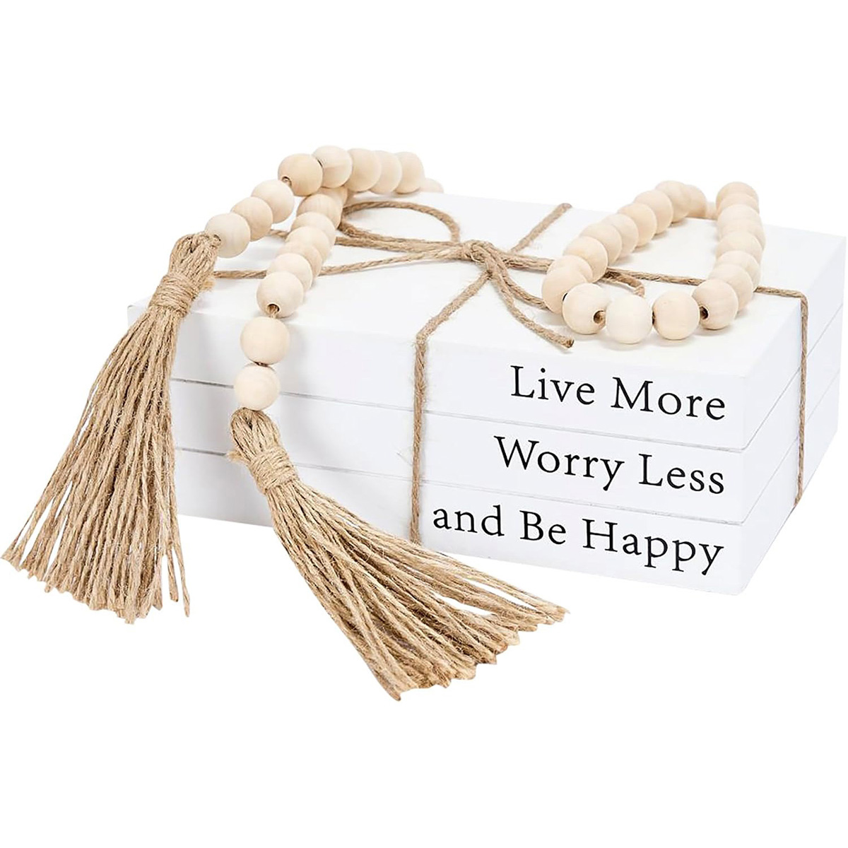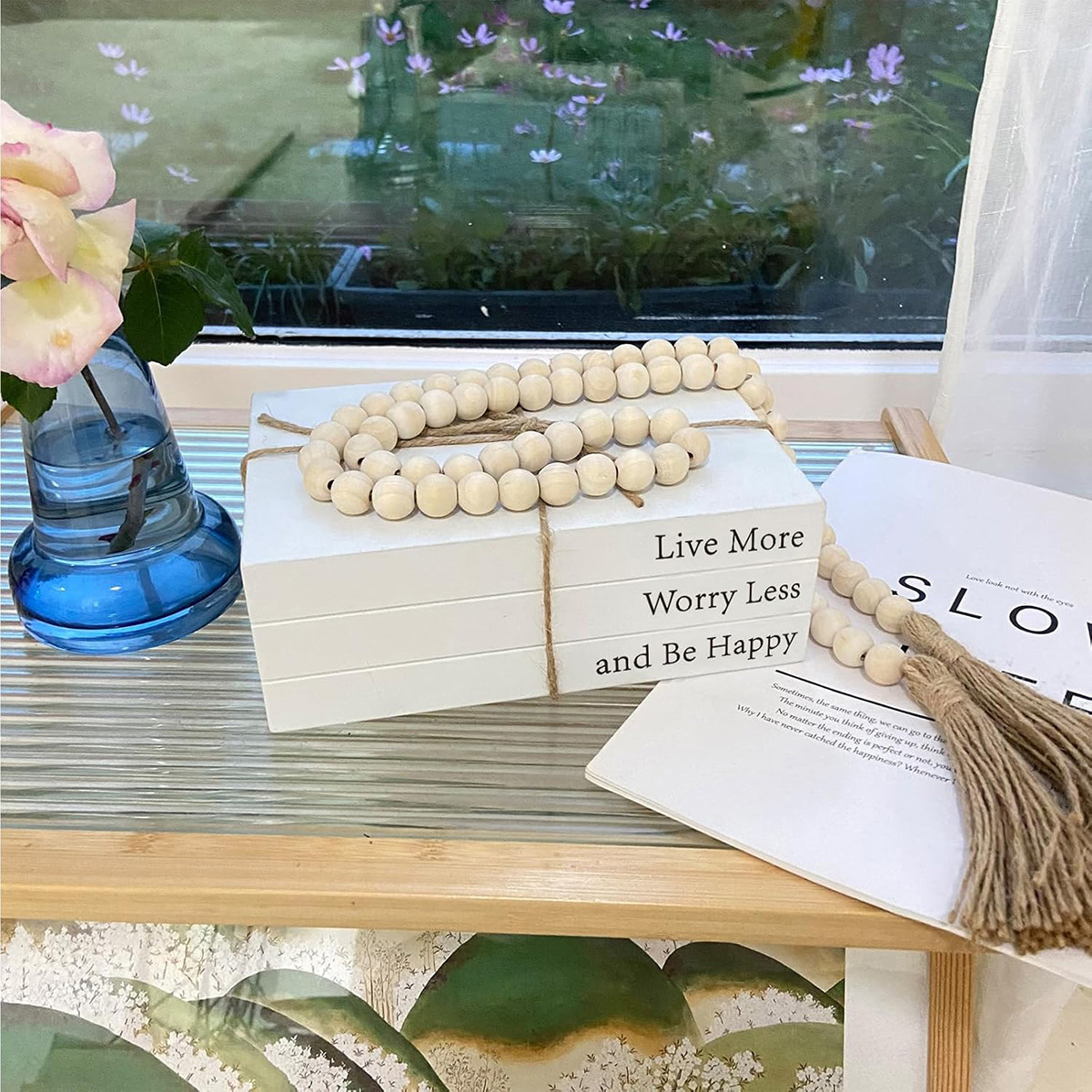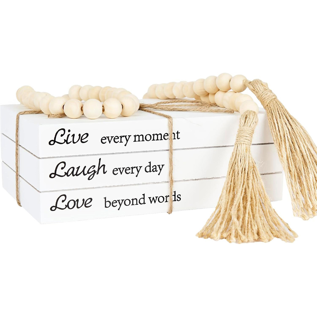 White Faux Books, Rustic Farmhouse Stacked Display Books with 52in Wood Bead Garland, (Live Laugh Love)