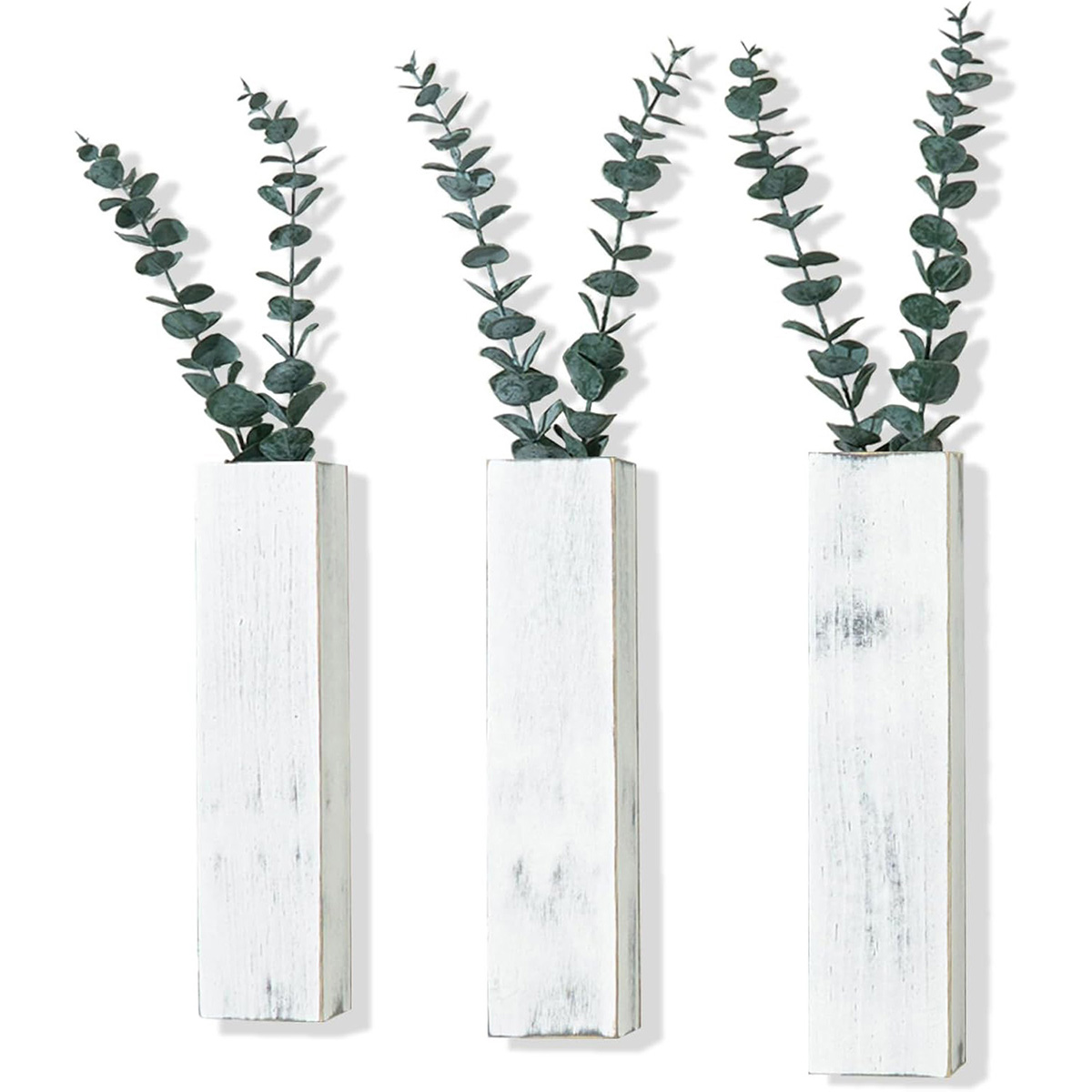 3 Pack Wood Wall Planters with 6 Pcs Artificial Eucalyptus, Plant Wall Decor, Rustic White