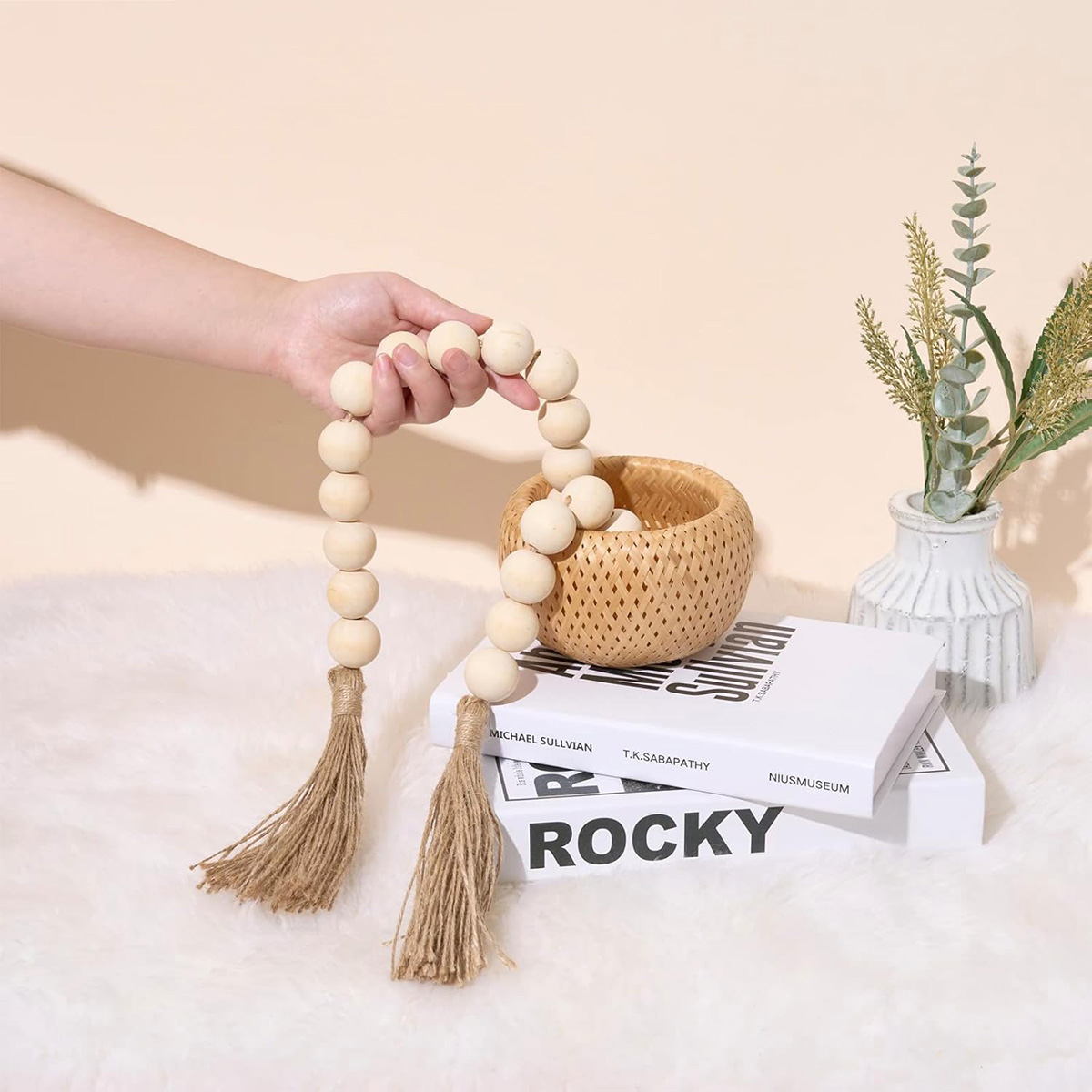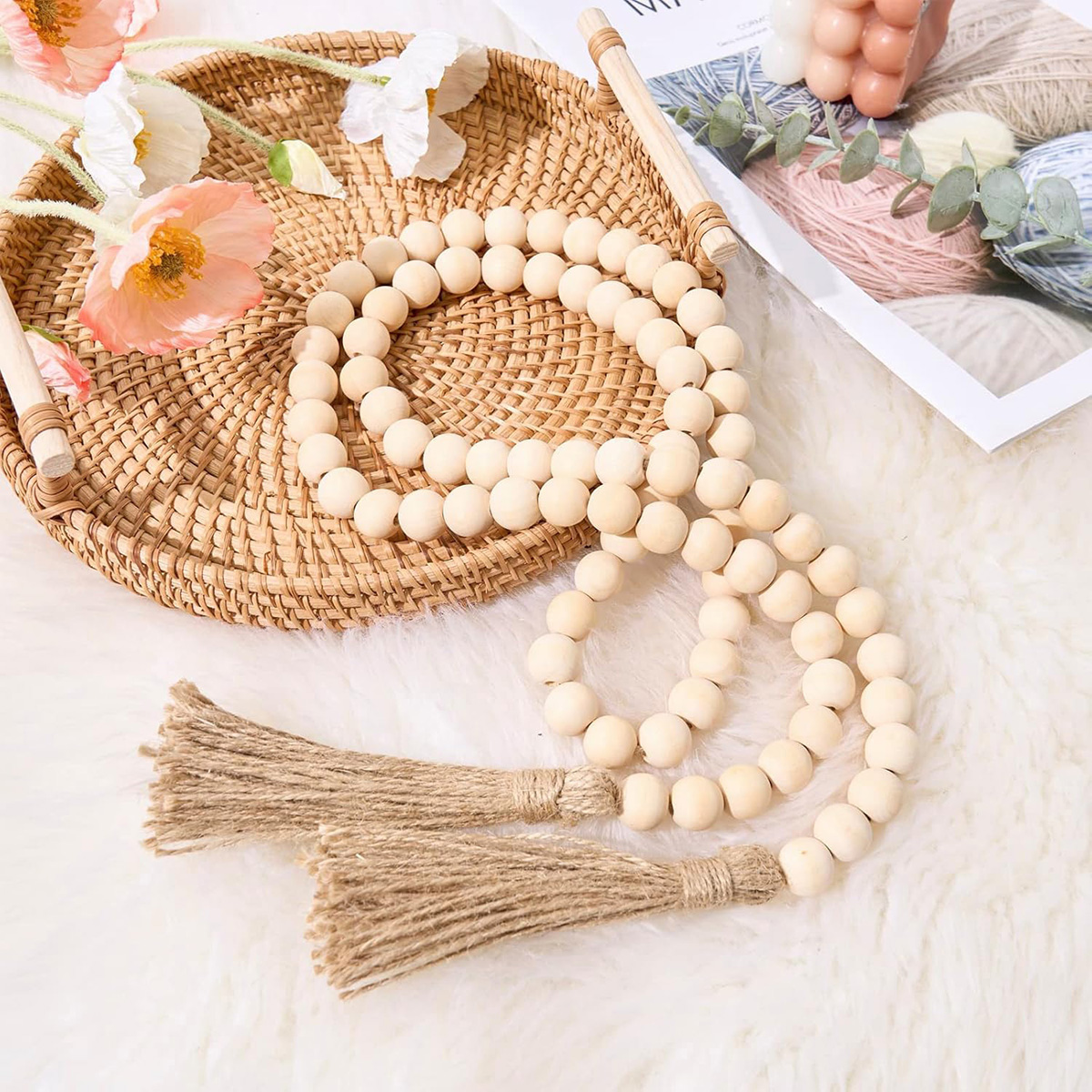 40" Long Large Wood Bead Garland with 1.2" Diameter Wooden Beads and Tassels, Decorative Beads with Tassels Beige