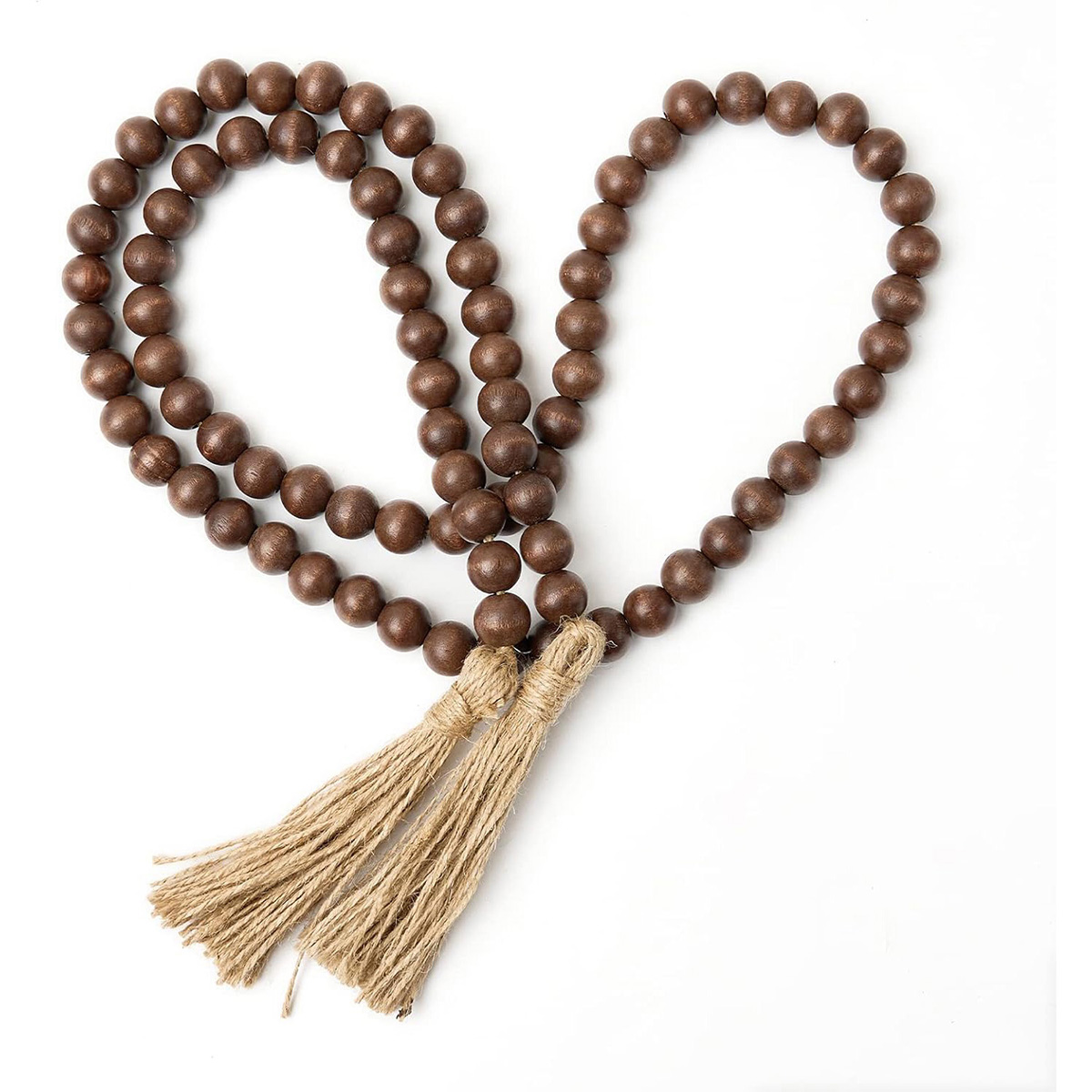 59in Wood Bead Garland with Tassels, Farmhouse Wooden Beads Garland, Dark Brown