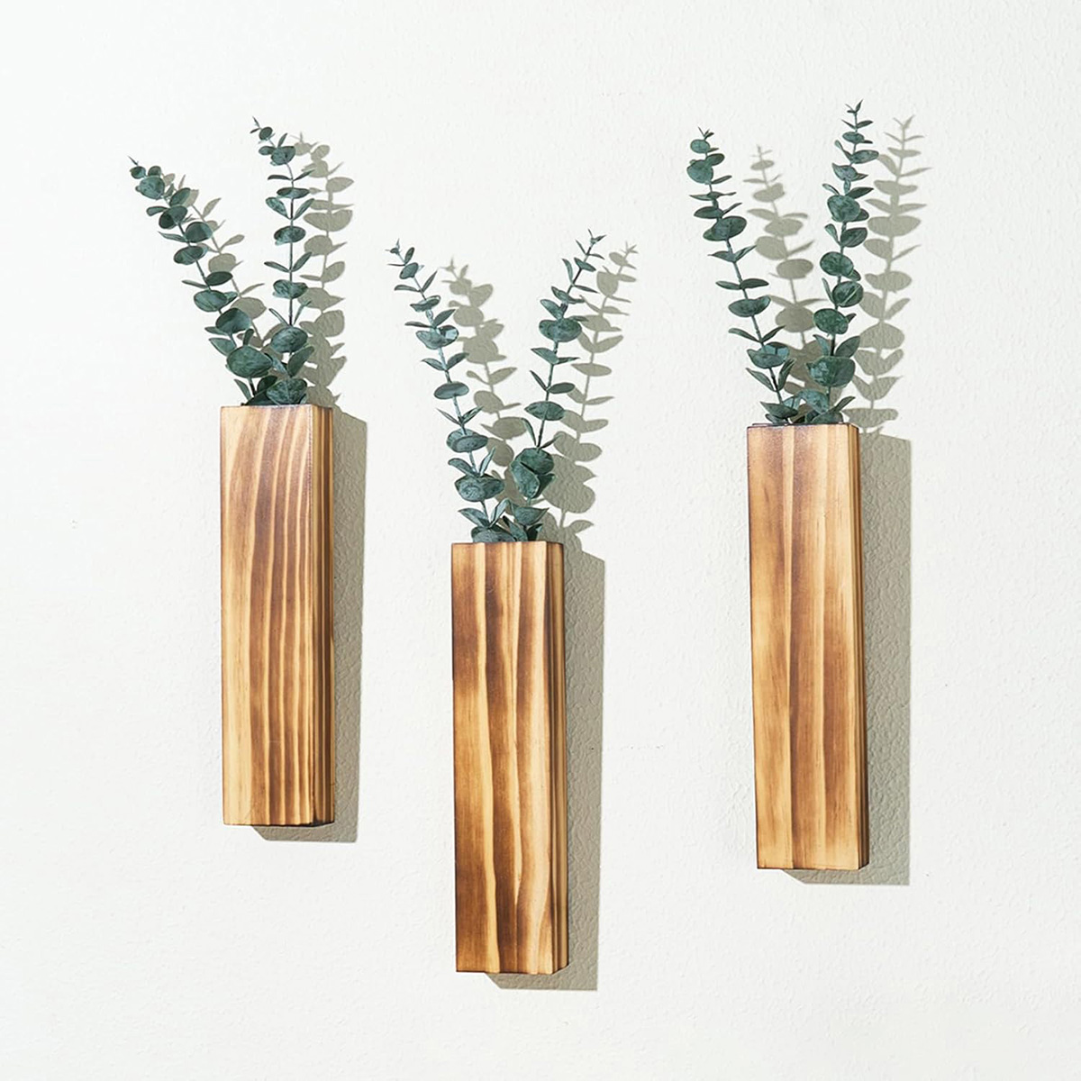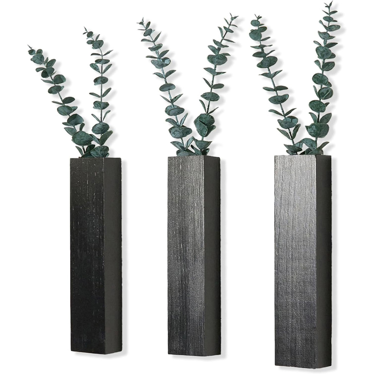 3 Packs Wood Wall Planters with Artificial Plant Eucalyptus, Plant Wall Decor, Black