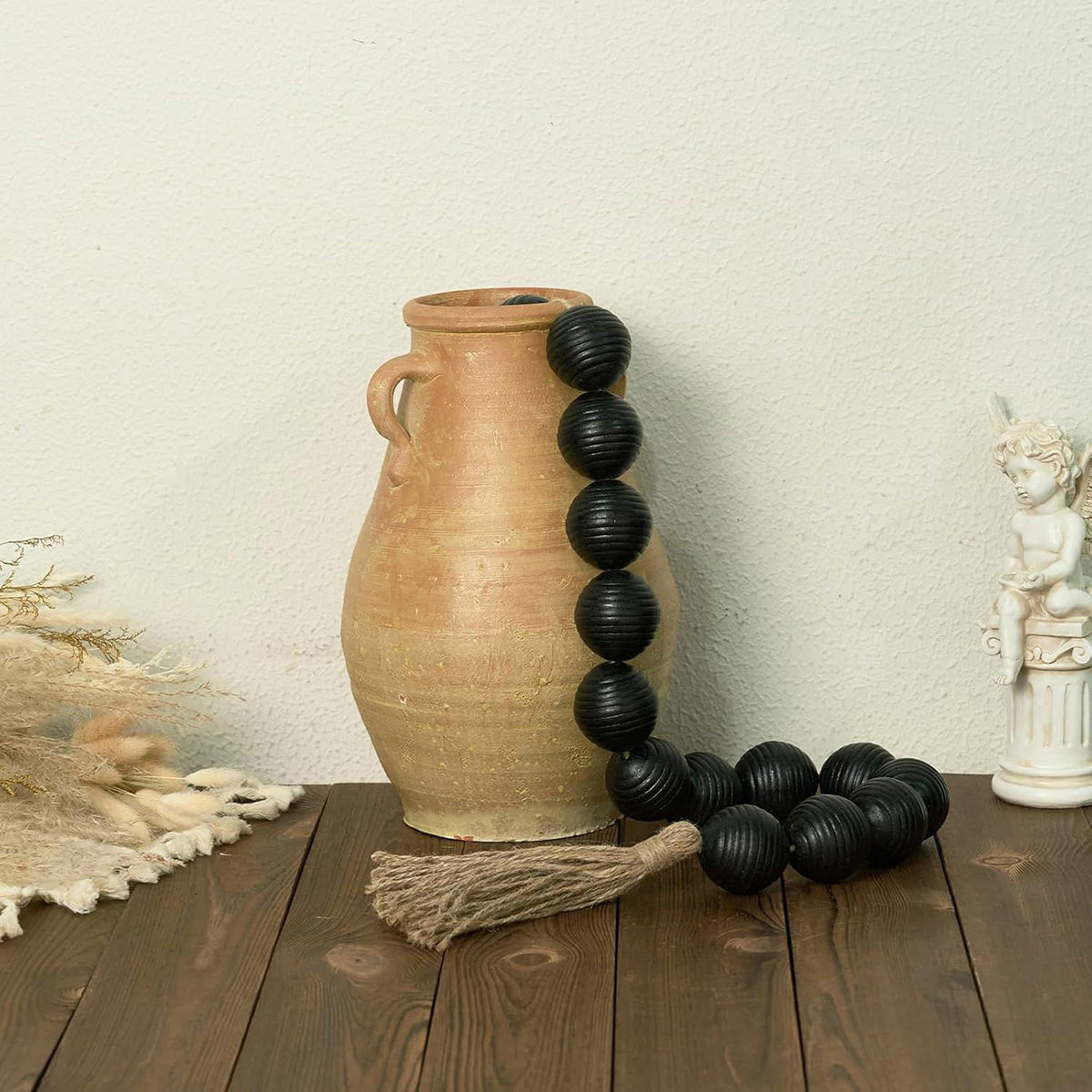 50" Long Ribbed Extra Large Wood Bead Garland with 2" Diameter Wooden Beads, Boho Decorative Beads Black