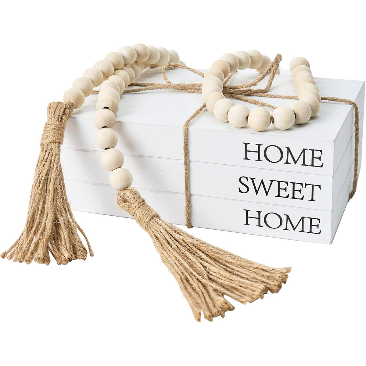 White Faux Books, Rustic Farmhouse Stacked Display Books with 52in Wood Bead Garland, (Home Sweet Home)