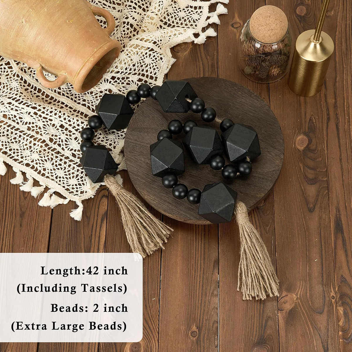 2" Octagonal Extra Large Wood Bead Garland with Tassels, 42" Long Rustic Farmhouse Wooden Beads Garland with Tassels, Black