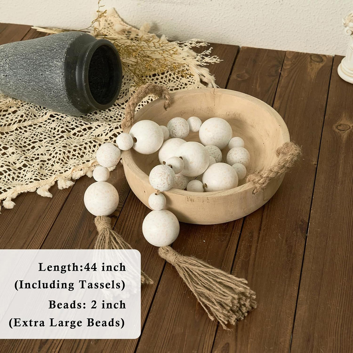 2" Extra Large Wood Bead Garland with Tassels, 44" Long Rustic Farmhouse Wooden Beads Garland, White