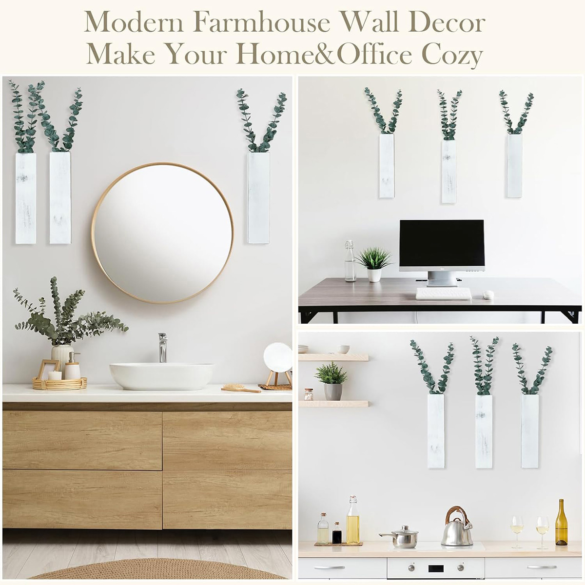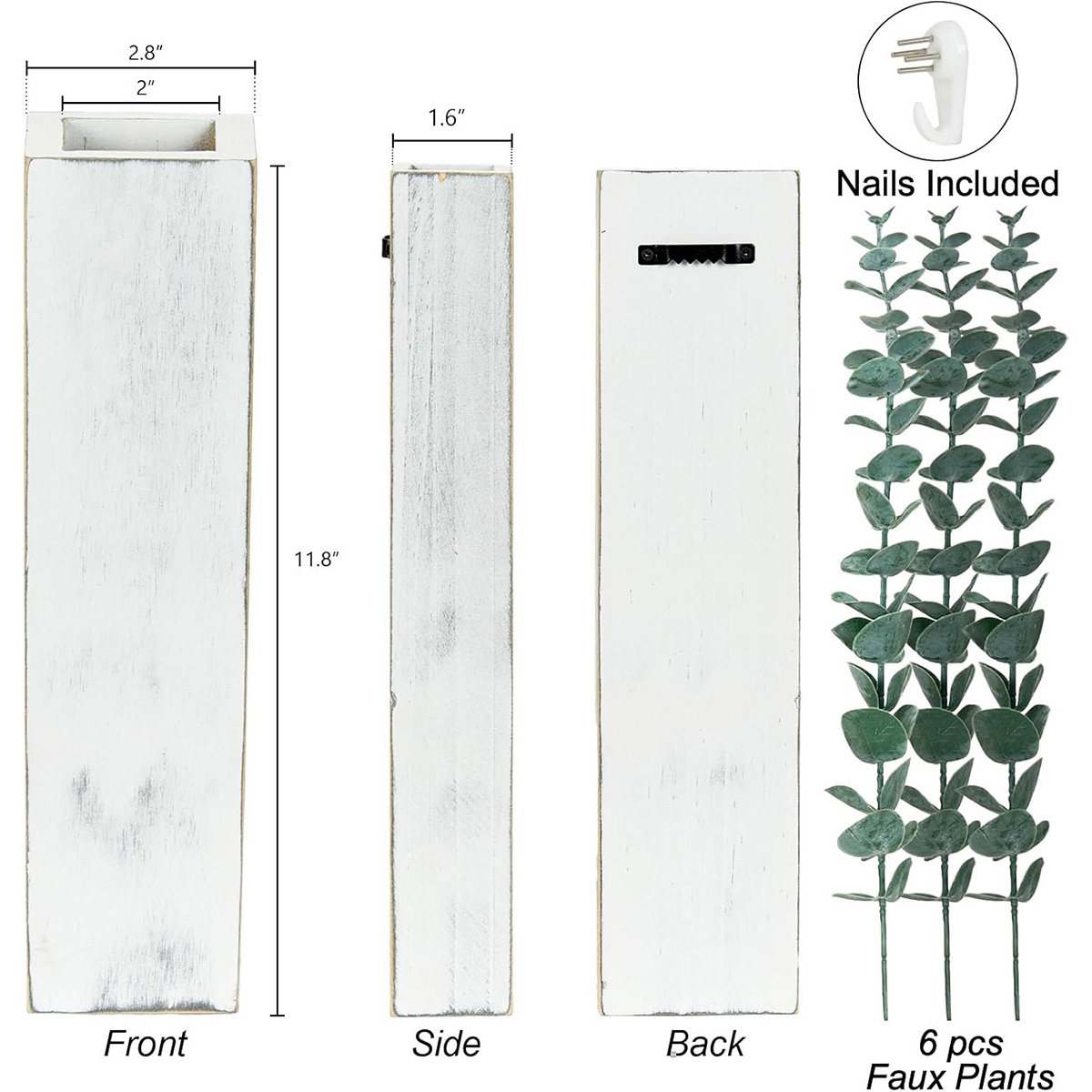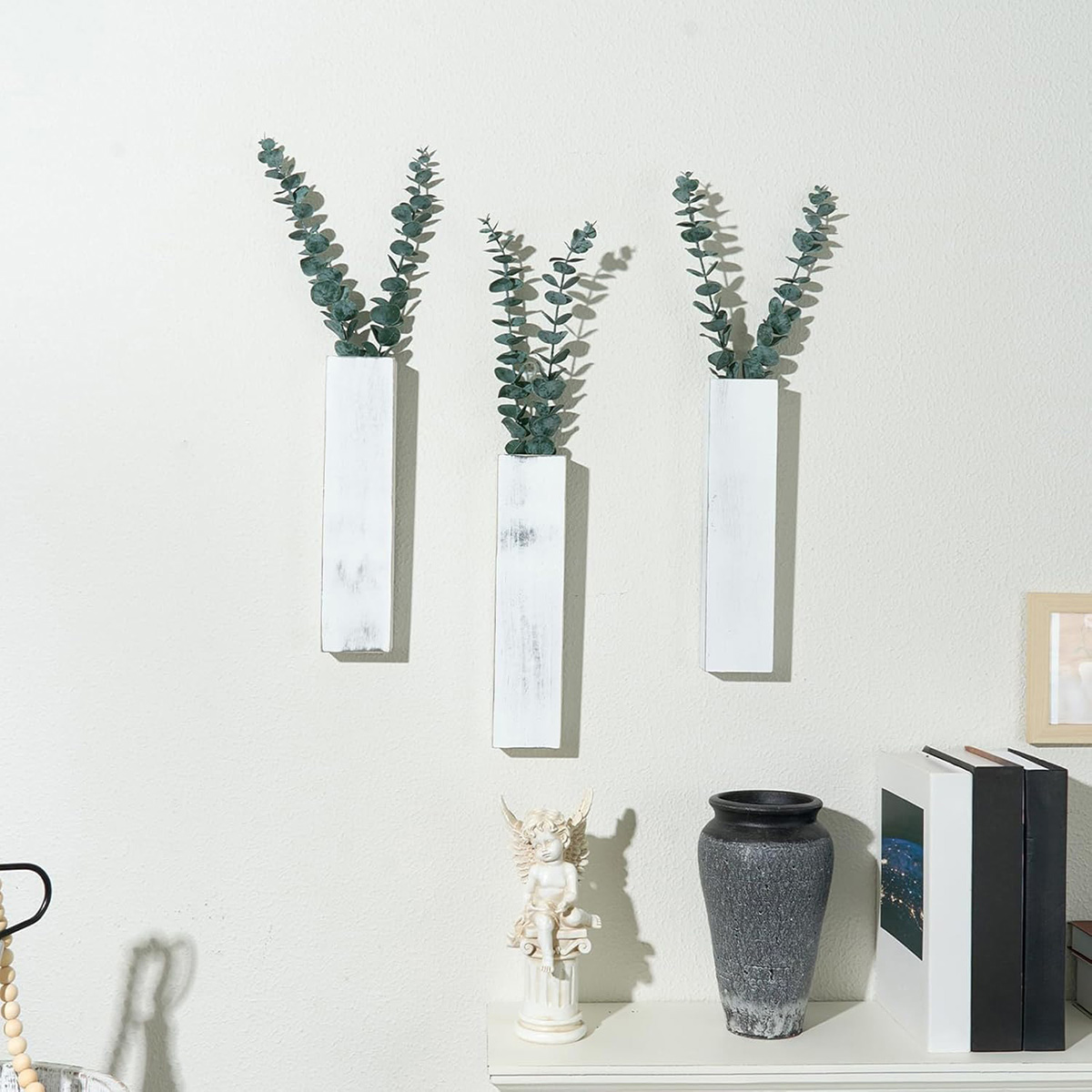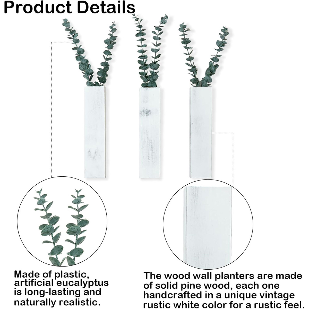 3 Pack Wood Wall Planters with 6 Pcs Artificial Eucalyptus, Plant Wall Decor, Rustic White