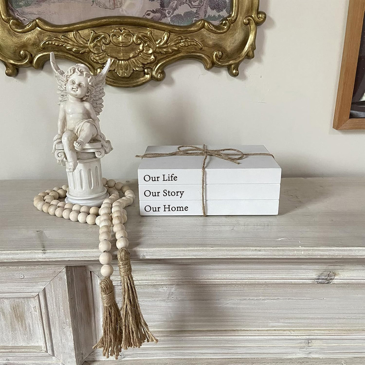 - What You’ll Receive: a set of decorative white books that say "Our Life Our Story Our Home". The set also includes a farmhouse bead garland with tassels, creating a stylish look for your bookshelf, nightstand, coffee table and fireplace.